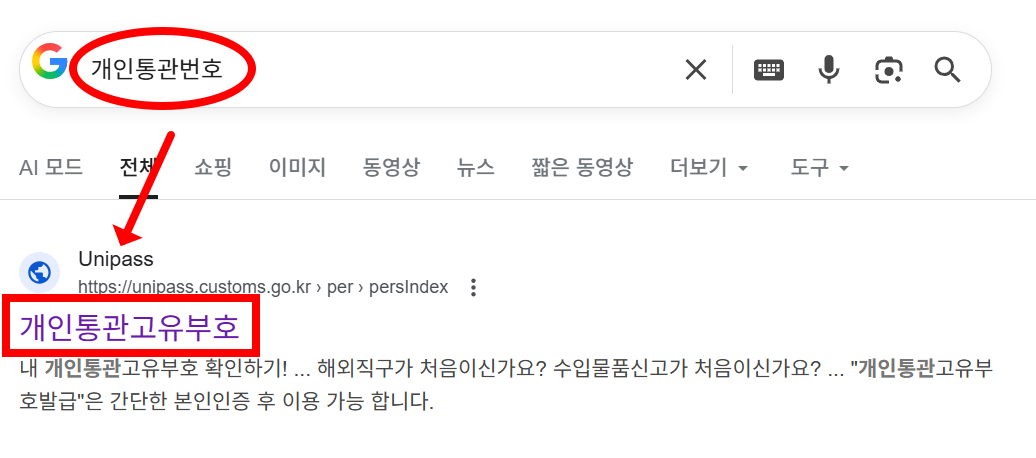 - 검색창에 '유니패스 개인통관고유부호'를 입력해 공식 사이트에 접속합니다.